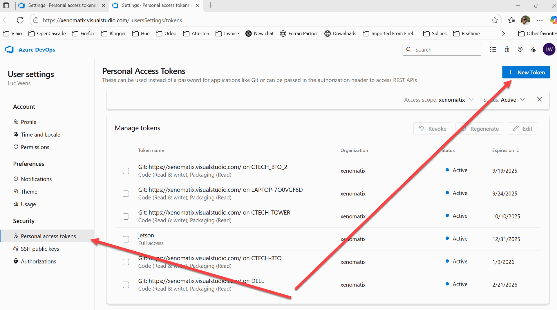 Go to Settings · Personal access tokens (Luc Wens) - Settings