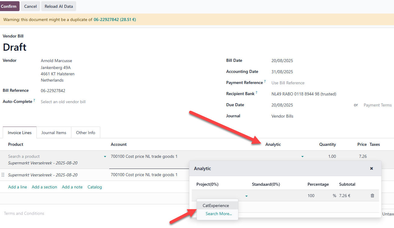 Als er een nieuw bonnetje toekomt, wordt die typisch in Odoo gesleept en automatisch gescanned. Zodra deze gescanned is kan je in de kolom Analytic een tag kiezen